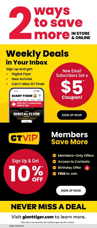 ⚡Save money with Giant Tiger Specials.⚡ Don't miss the specials on offer now from Giant Tiger by checking out the Giant Tiger catalogue valid from 11 mars until 17 mars. View the weekly Giant Tiger catalogue to see this week's specials valid from 11 mars until 17 mars. Share your opinion about the products you love and bought in Giant Tiger. Browse the latest catalogue and offers of all your favourite stores and dont forget to subscribe to our newsletter to receive exclusive offers and the latest catalogues directly on your mail.